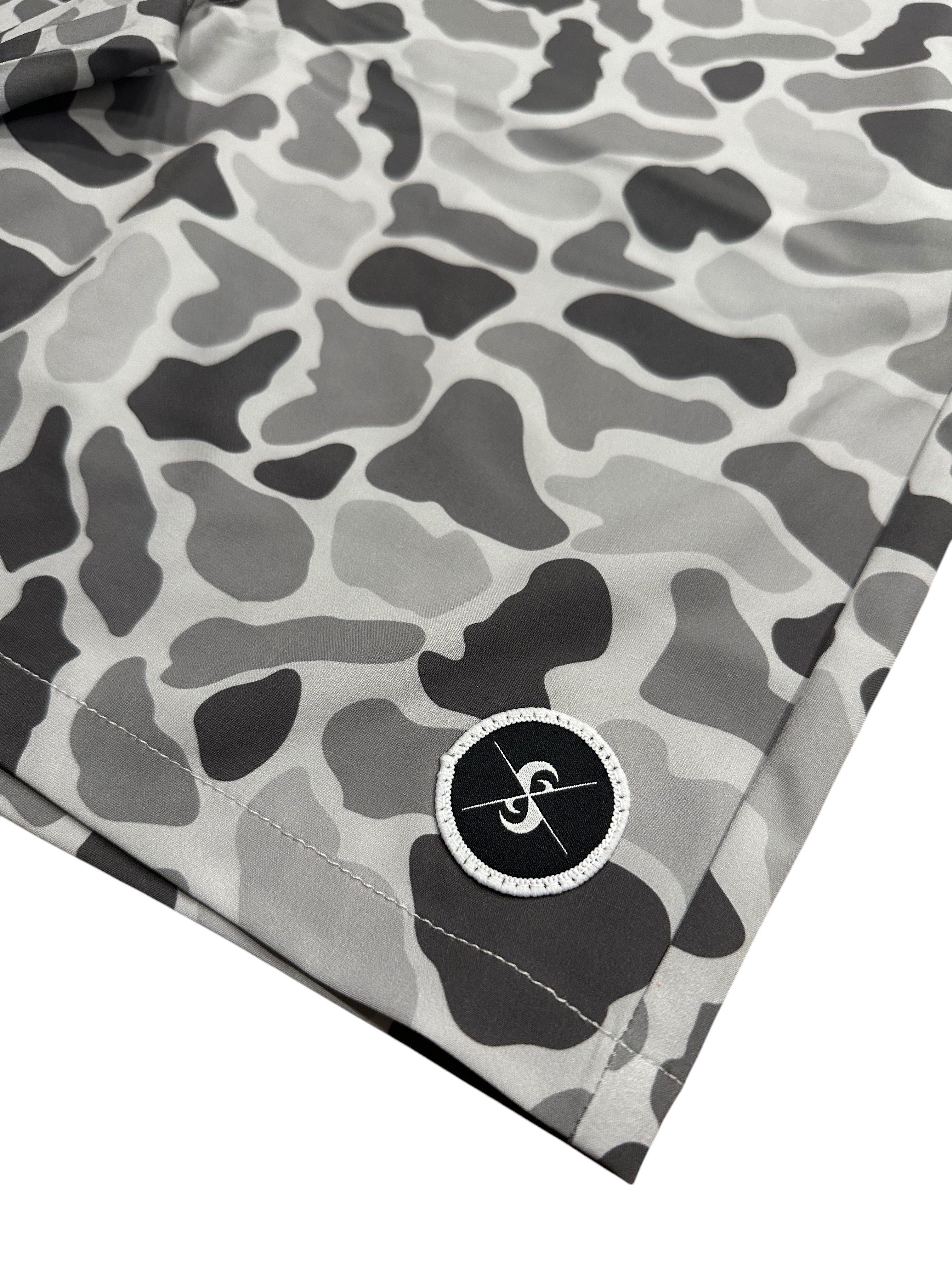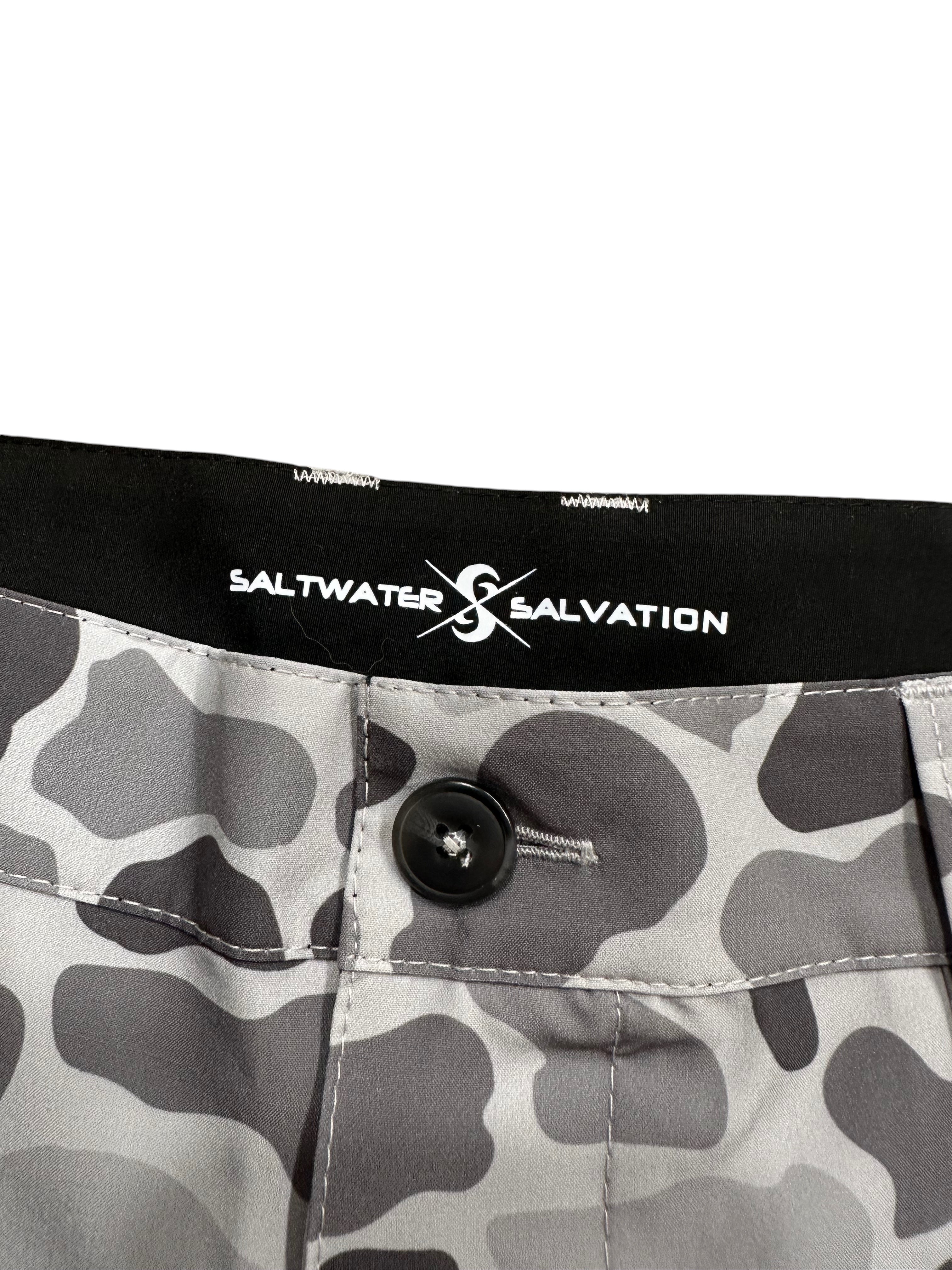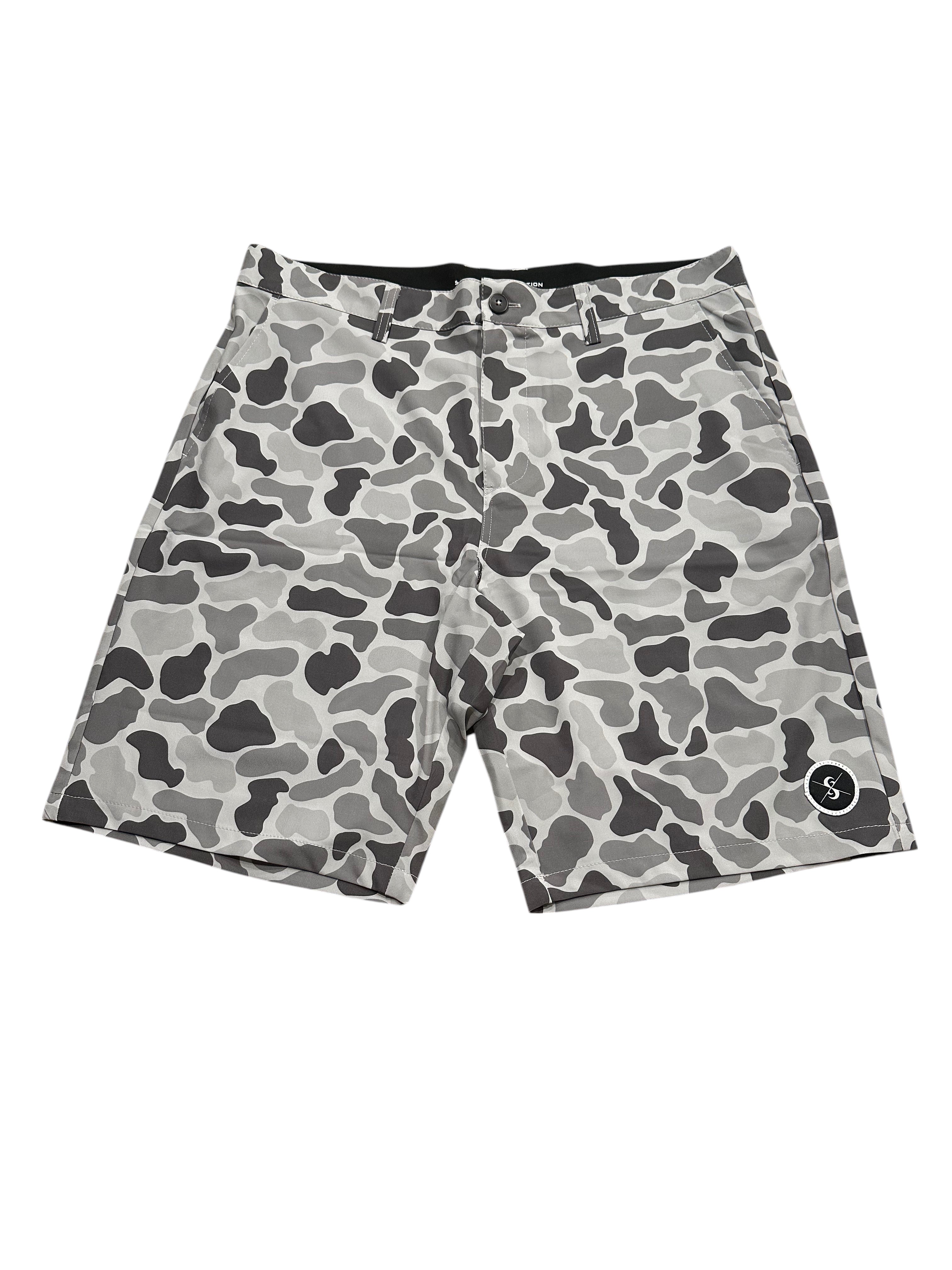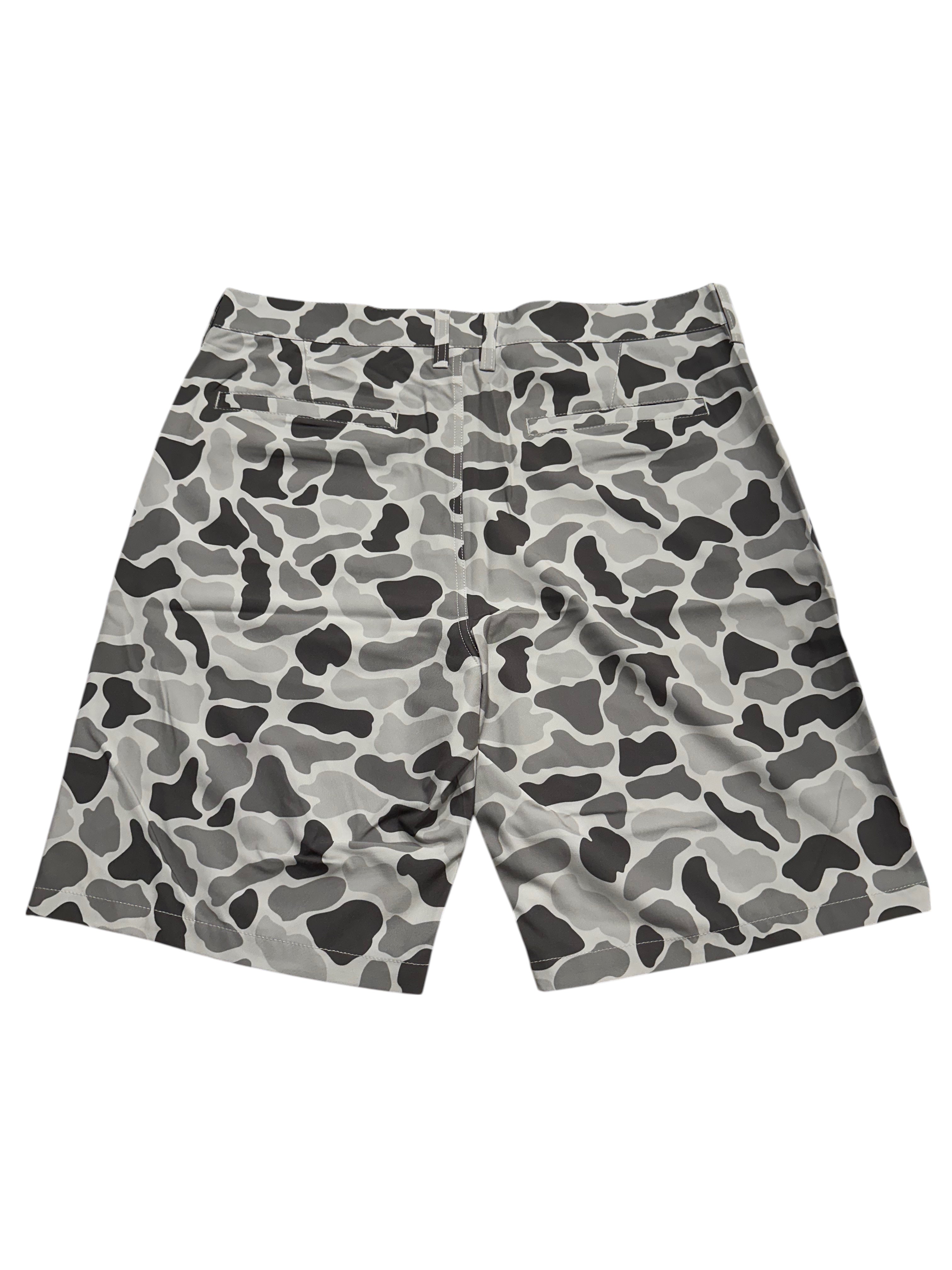 Designed in a sleek grey duck camo pattern, these versatile shorts bring rugged style to your everyday look. Lightweight yet durable, they're perfect for casual outings, beach days, boat days, or just relaxing with a cold one.